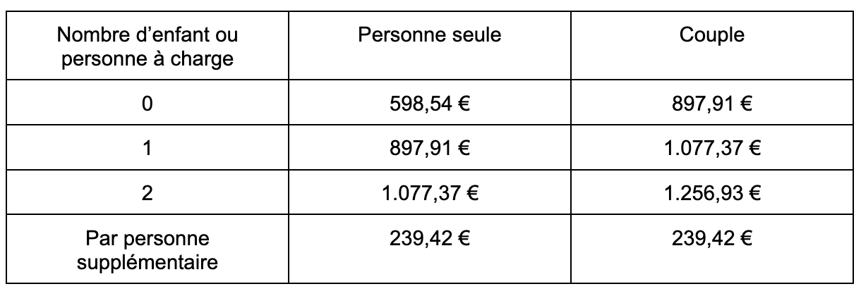Le montant du RSA qui est accordé aux personnes âgées entre 18 et 25 ans est similaire au RSA des plus de 25 ans. Il se base selon le barème suivant.